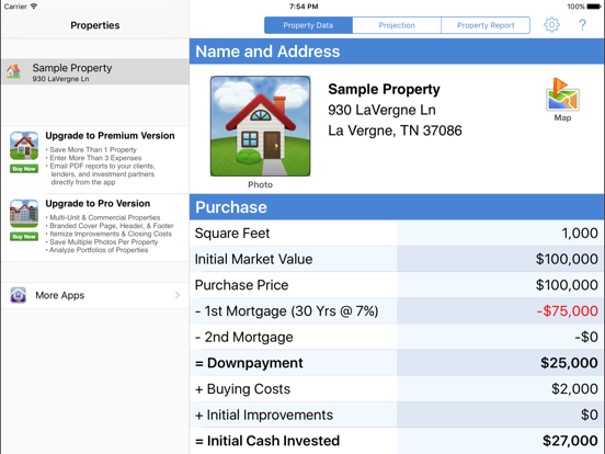Property Evaluator is the most powerful real estate investment analysis software for the iPad and iPhone. After entering some information about the property, you can view performance projections that help you do a true apples-to-apples comparison between properties. You can also email a professional PDF report to your clients, lenders, or investment partners.