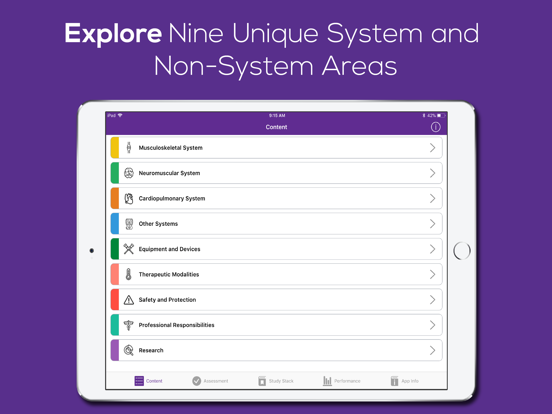 Physical therapist assistants can review selected content by scrolling through subcategories in each of the system and non-system areas. Our innovative design presents academic content in a user-friendly format that allows users to easily digest essential information. Users rate their competence in a variety of topics and create personalized Study Stacks. Study Stacks allow users to efficiently remediate identified academic deficiencies. Frequent review of essential academic content allows users to successfully convert the information to long-term memory.