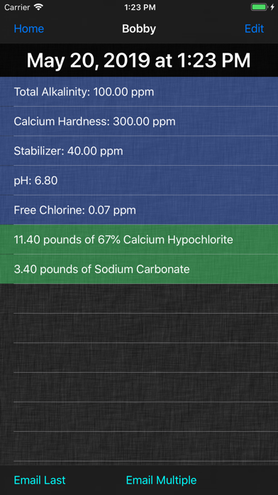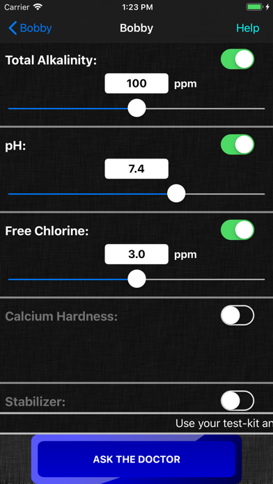 With Pool Doctor, you can adjust the chlorine, bromine, salt, pH, total alkalinity, calcium hardness, and even the cyanuric acid levels in all of your pools. You can even configure the ideal ranges and chemicals used to treat the pools (see screenshots).