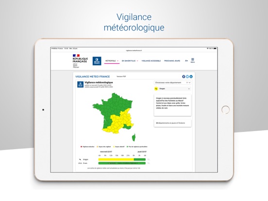 En cas de vigilance, un clic sur la carte donne accès au bulletin national et à la liste des départements en vigilance (jaune, orange ou rouge). Par cette liste, accédez aux bulletins départementaux de vigilance.