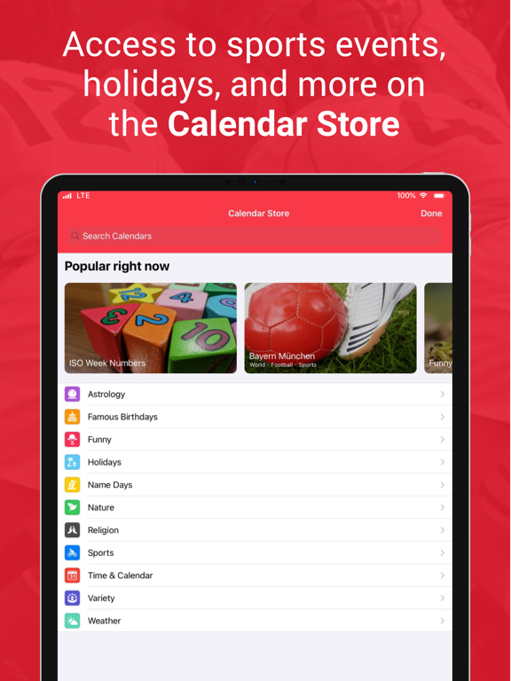 The Calendar Store allows you to add curated and auto-updating calendars focused on major events. Top categories include World Sports, Holidays, Weather, Nature and Religion.
