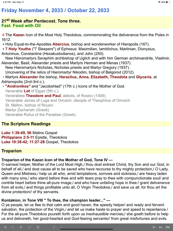 Orthodox calendar with lives of the saints, icons, troparions and kontakions. Daily Scripture readings. Feasts, fast days, days of remembrance. Julian Version ("Old Calendar")
