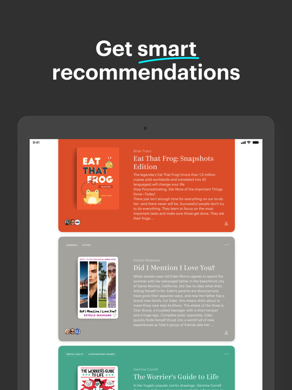 Experts and other booklovers create themed bookshelves. Browse them, subscribe and receive regular updates. Bookmate also makes recommendations based on your preferences. The more you read or listen, the more accurate our recommendations!