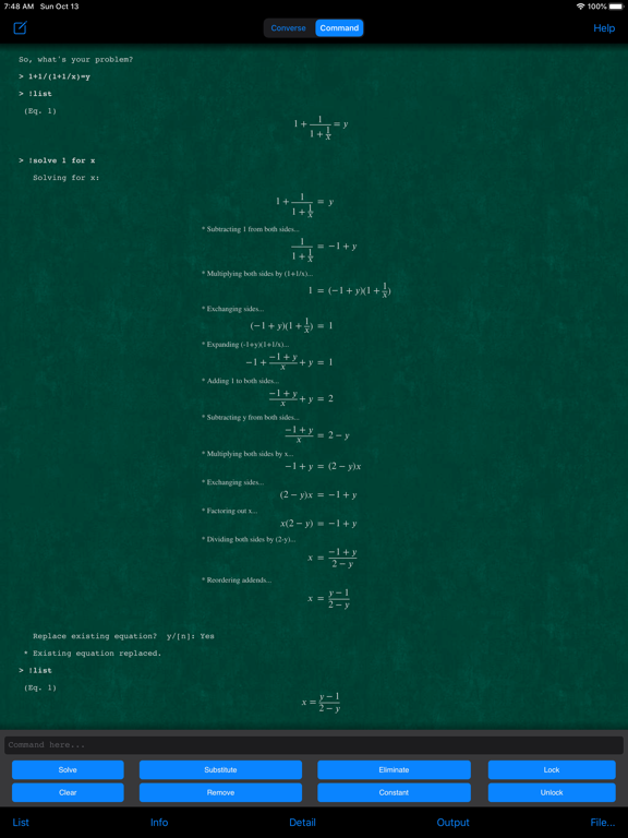 - Instead of a one-line, numeric display, its output scrolls indefinitely, showing variables, expressions, and equations that are formatted and easy to read!