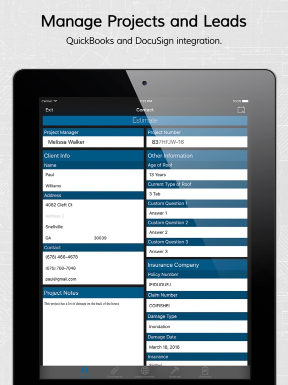 • Collect client info, insurance info (if necessary), project notes, etc.
