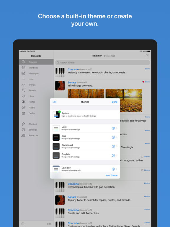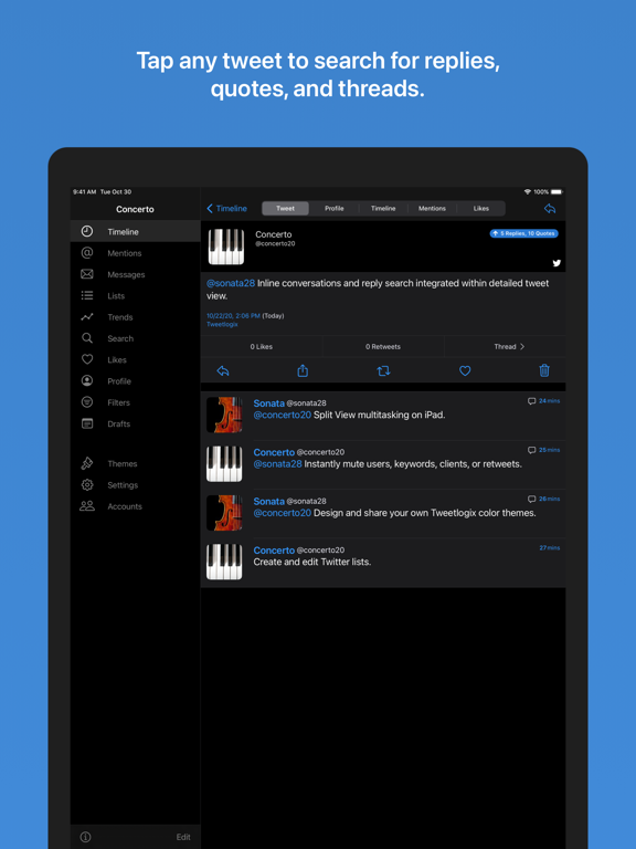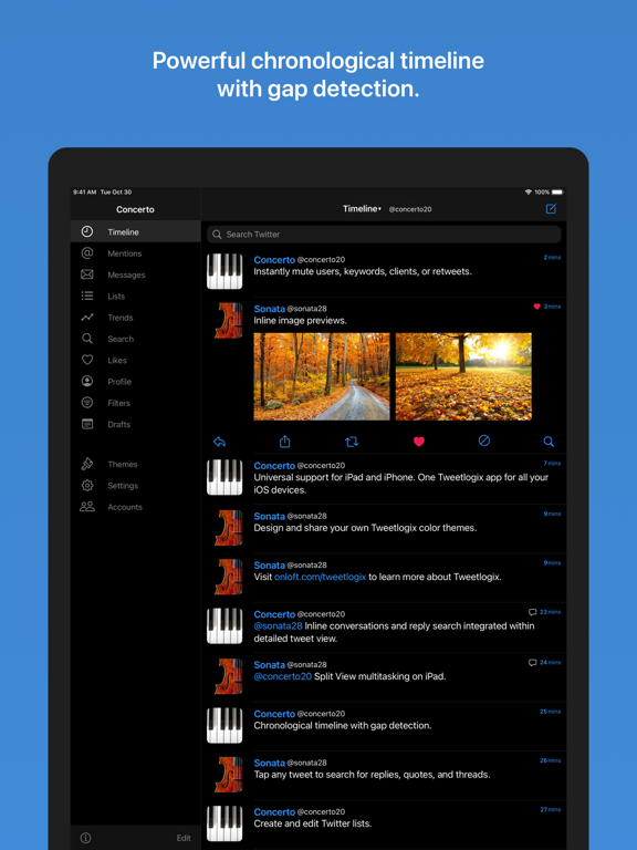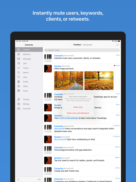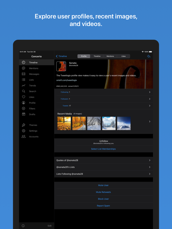 Enjoy Twitter with the powerful and customizable Tweetlogix client. Since 2010, Tweetlogix has helped users get the most from Twitter with its speed, simplicity, and powerful filtering. Silence Twitter noise by muting users, keywords, phrases, retweets, and clients. Design your own color themes, create Twitter lists, search nearby, and much more.
