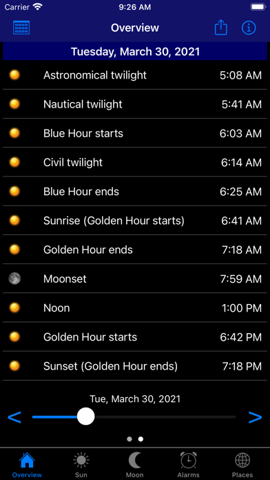 Calculate times of sunrise, sunset, moonrise, moonset and more for your location at any given date.