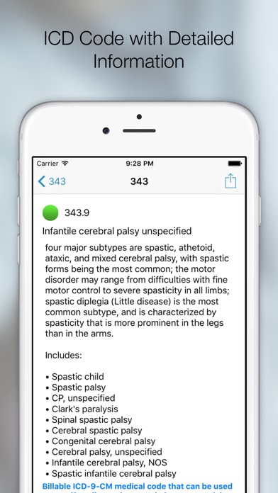 - For testing purpose, this app contains complete implementation of ICD-9-CM diagnosis codes, all of them updated to 2016 effective October 1, 2016.