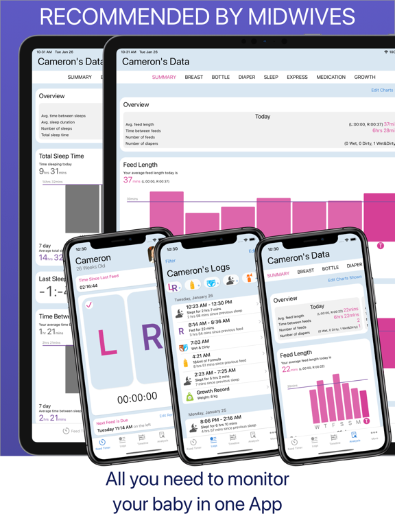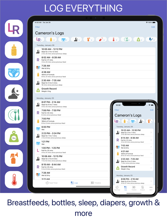 √ Log breastfeeds, bottle feeds, breast pumps, diapers, sleep, solid food, baby's weight, baby's length, medication, make notes and set reminders