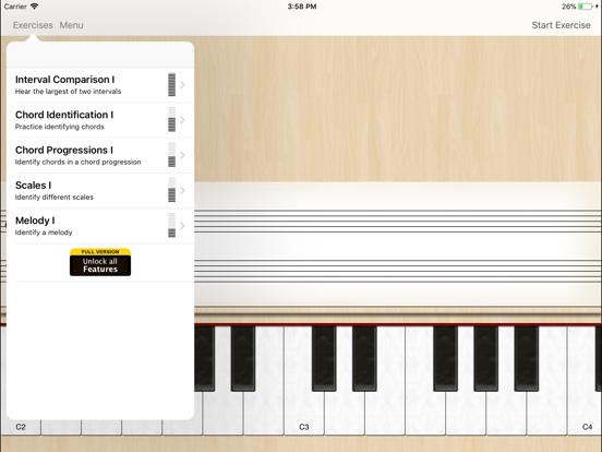 Each exercise has a short description of its purpose and optional preview. A virtual piano keyboard in each exercise helps you visually understand and analyze the notes that have been played. To aid your progression you can compare the different options after answering. (You can even play the virtual piano if you like!)