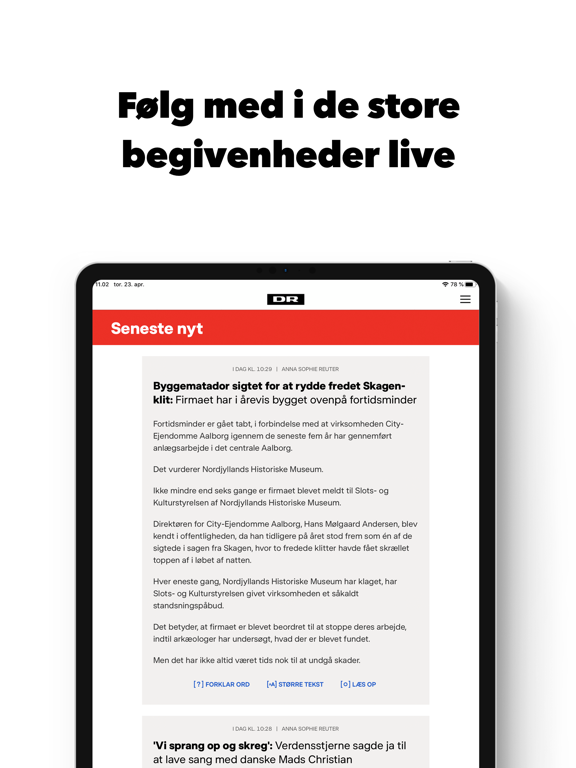 I appen DR Nyheder giver vi dig de seneste nyheder og de helt store begivenheder, mens de sker. Her finder du dagens historier, live blogs og breaking news sammen med analyser og perspektiv fra DRs eksperter og journalister. DR Nyheder opdateres hele døgnet med nyt fra det ind- og udland og sport.