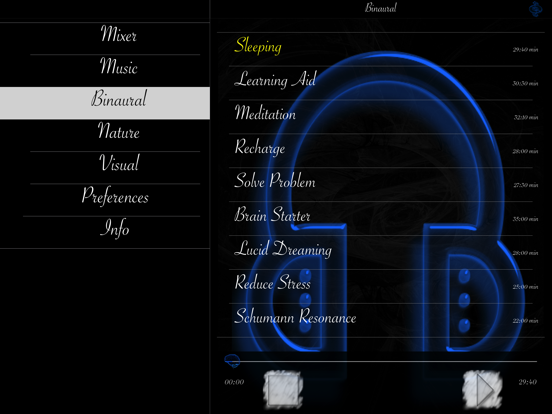 * 9 harmonic progressive binaural beats sessions (Lucid Dreaming, Reduce Stress, Solve Problem and Learning Aid, Schumann resonance included), each about 30 minutes long