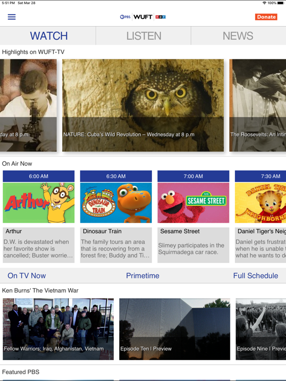 The WUFT Public Media App allows you to watch and listen to all of WUFT’s programs, Radio and TV! The app provides On-Demand content of all your favorite shows, live streaming of the radio channels, PBS Kids! content with parental controls, easy access to the live Radio and TV program schedule plus the ability to explore additional content!