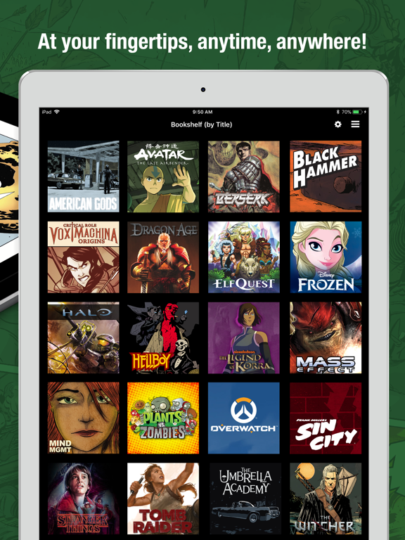 5000+ comics and books with more added every week, including 300, American Gods, The Art of Rick and Morty, Astro Boy, Avatar: The Last Airbender, B.P.R.D., BANG!, Beasts of Burden, Berserk, Black Hammer, Blade of the Immortal, Creepy, Critical Role, Cyberpunk 2077, Dragon Age, EC Archives, Eerie, ElfQuest, Emily the Strange, Empowered, Fight Club 2 and 3, Disney Frozen, Disney•PIXAR The Incredibles 2, Disney•PIXAR Toy Story, Disney Zootopia, God of War, Grendel, Groo, Halo, Harrow County, He-Man, Hearthstone, Hellboy, How to Train Your Dragon, James Cameron's Avatar, Kabuki, The Legend of Korra, The Legend of Zelda, Lone Wolf and Cub, Frank Miller’s Sin City, The Mask, Mass Effect, Mind MGMT, Minecraft, Mob Psycho 100, Mystery Science Theater 3000, Neon Genesis Evangelion, Overwatch, Plants vs. Zombies, Polar, Resident Alien, Starcraft, The Strain, Stranger Things, Super Mario Encyclopedia, Tarzan, The Terminator, Tom Clancy's The Division, Tomb Raider, Trigun, The True Lives of the Fabulous Killjoys, Umbrella Academy, Usagi Yojimbo, The Witcher, World of Tanks, World of Warcraft, Zodiac Starforce, and many, many, more!