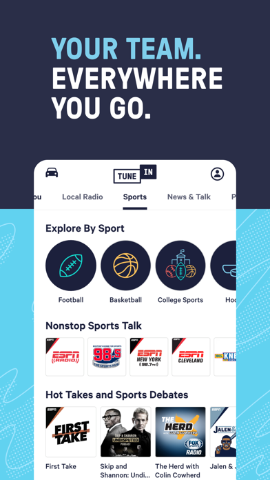 • Sports: Listen to your team wherever you go with local, national and global sports talk stations.
