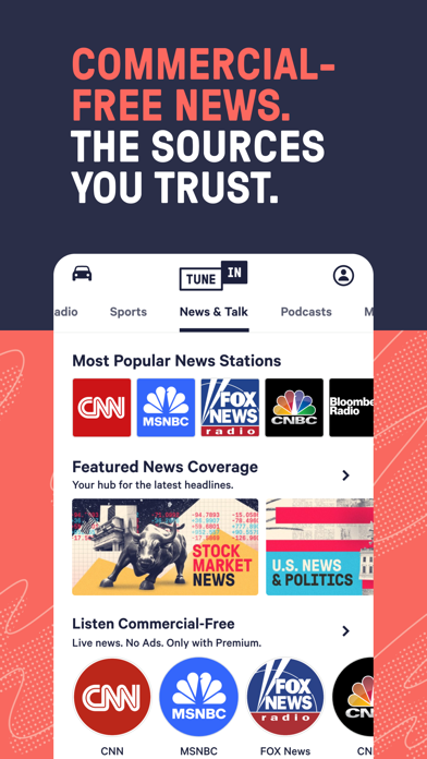 • Commercial-Free News: The only place where you can listen to CNBC, CNN, FOX News Radio, MSNBC and Bloomberg Media without commercials.