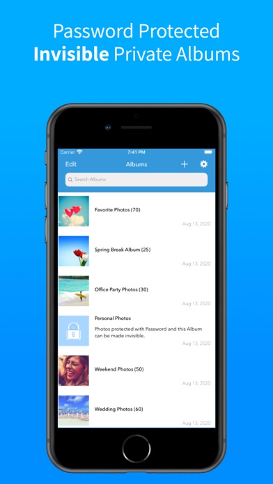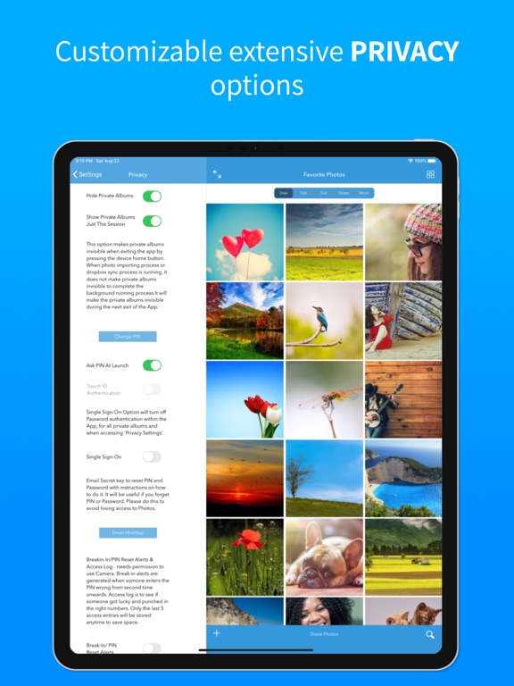 ▶ Customizable privacy levels, PIN at App launch, Password for private albums and make private albums invisible.