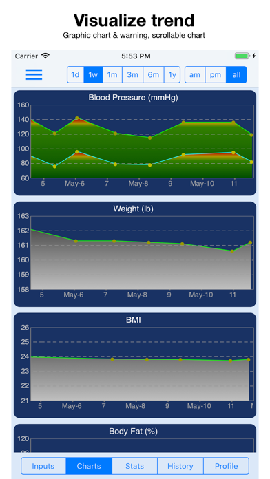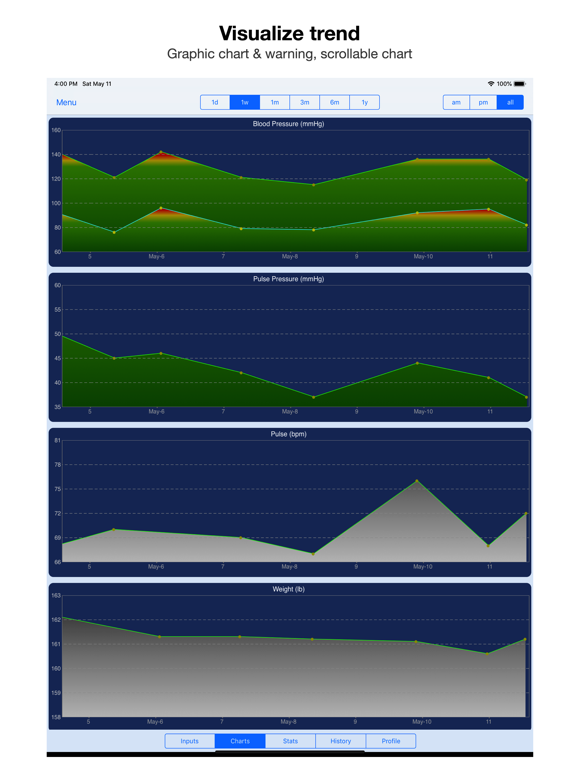 Data visualization – a chart is worth a thousand words. The graphical charts not only give you a visual trend of the vital signs, but also show warning signs (BP only).