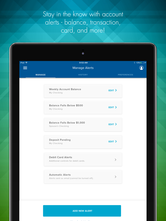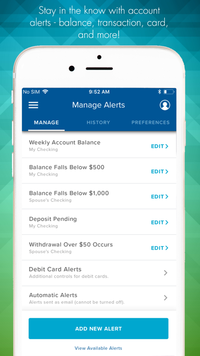 - Stay in the know with text or email alerts for balances, transactions, cards, and payments