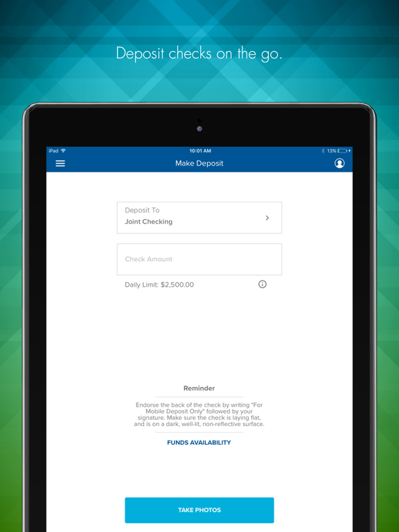 - Deposit checks – Take a picture of your check with your smartphone and deposit via Mobile Check Deposit