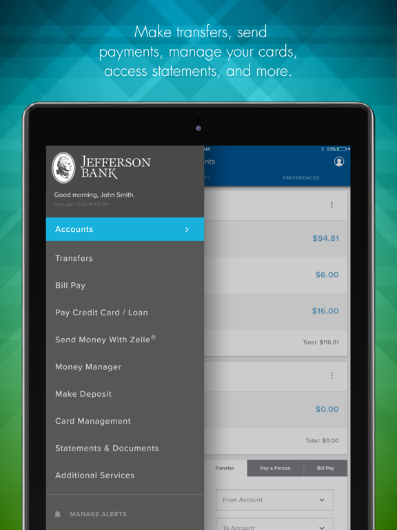 - Simply swipe down on the Jefferson Bank Logo on the App Login to view your account balances and recent activity.