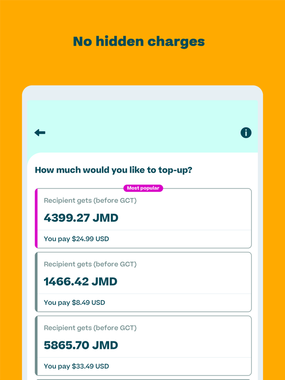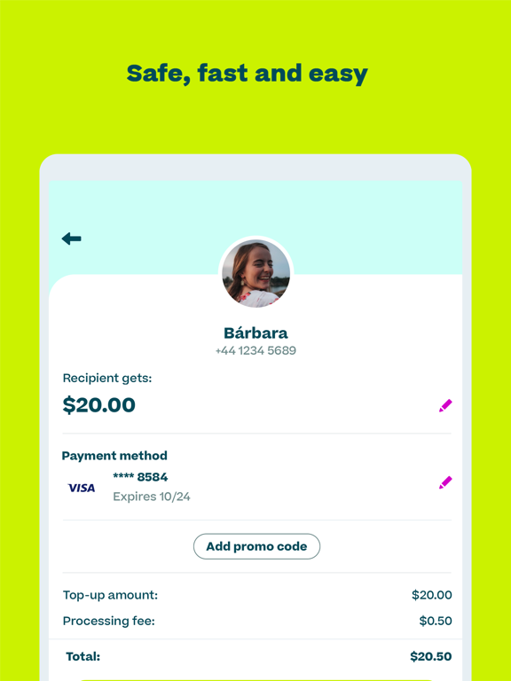 It’s very easy to use. Simply choose a contact, select a top-up amount and then pay. You can use any major credit or debit card, PayPal or Apple Pay. We don’t have any hidden or confusing fees. You’ll always know how much you’re spending and how much they’ll receive.
