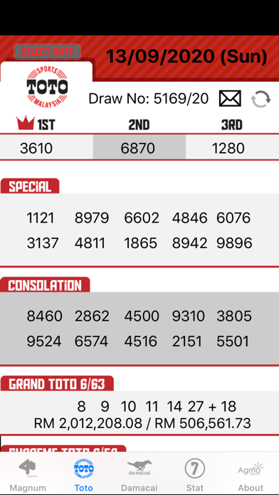 It provides latest and fastest lottery result in Malaysia. It lets you to find out the live and past result of Magnum, Da Ma Cai (3D, 4D and 6D) and Sports Toto (4D, 5D, 6D, Supreme Toto 6/58, Power Toto 6/55, Star Toto 6/50) quickly. The only 4D mobile apps that allows you to check out all past winning history from all Magnum, Toto and PMP Damacai. It is all-in-one application. Fully support retina display on both iPhone and iPad!