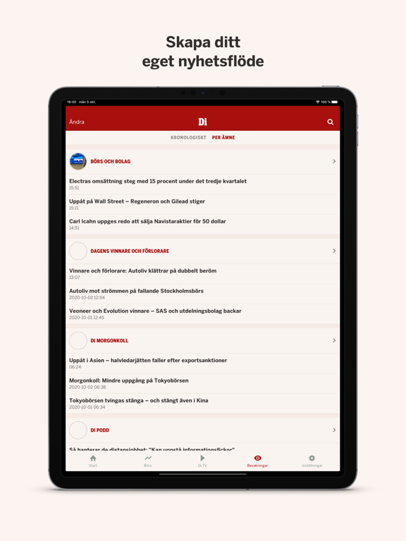 I Di-appen får du nyheter inom ekonomi och näringsliv som ett kontinuerligt nyhetsflöde med de senaste händelserna i topp.