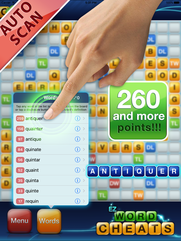 An ad-free, smart cheat app for Words With Friends and Scrabble. We automatically input the board and find the best moves for you! Now you can cheat or play jokes on your friends by making 80 point moves, or improve your skills using the built-in dictionary and anagram finder.