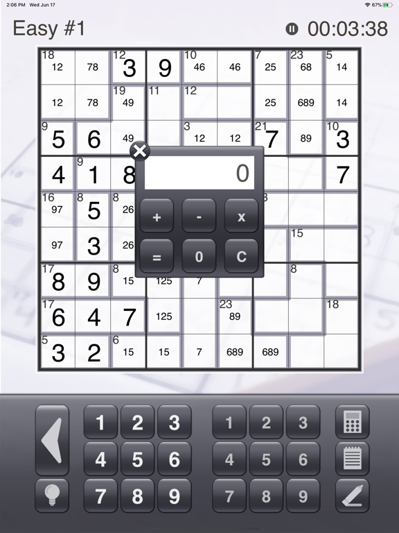 Solving a killer sudoku puzzle requires a lot of notes, so we worked hard to make the note entry features in this app perfect. A dedicated note keypad and the ability to select multiple squares makes entering notes fast. You can even make combination lists that float above the puzzle and can be rearranged on the screen! Cross out combinations from your lists as you rule them out.