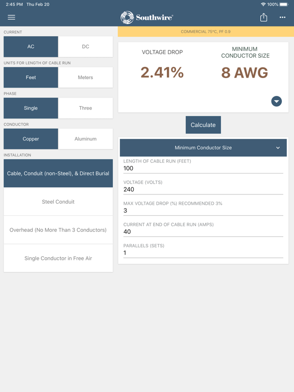 Southwire's voltage drop calculator will help you determine the proper wire size for an electrical circuit based on the voltage drop and current carrying capacity of an electrical circuit. Determines wire size to meet specific voltage drop limits or calculates voltage drop for a specific conductor run. When sizing conductors, calculations limits wire size to voltage drop and NEC ampacity. Southwire's Voltage Drop Calculator is designed for applications using AWG and KCMIL sizes only.