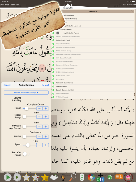 ● Advanced audio options (repetition of aya, interval, recitation speed, AirPlay)