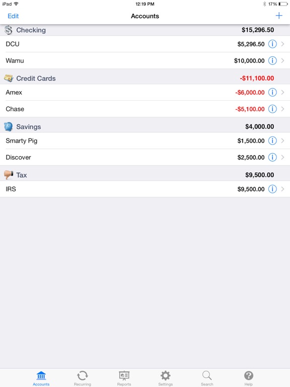 Create Multiple Accounts (Checking,Savings,Debit,Cash etc.) with Custom Grouping.