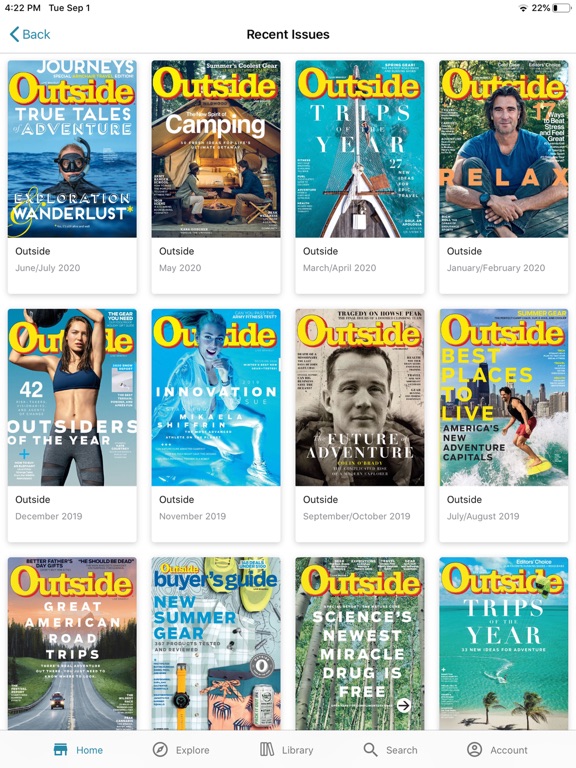 To purchase a complete issue, enter the in-app store and buy issues for US$5.99 or a one-year iPad subscription US$23.99, including all monthly issues plus special issues published over a 12-month period. Outside publishes six issues a year.