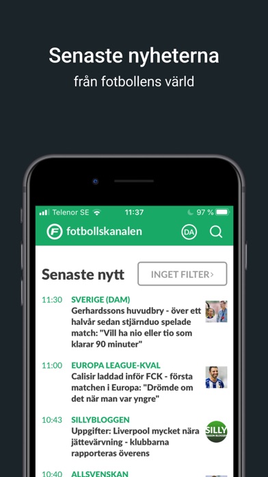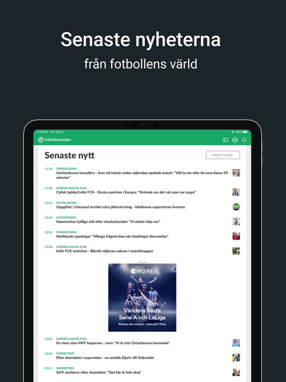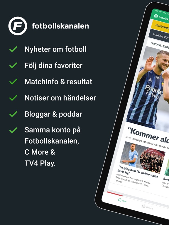 Med Fotbollskanalen håller du koll på matcher från Allsvenskan, Superettan, Damallsvenskan, stora europeiska ligor och internationella mästerskap. Dessutom får du de senaste nyheterna, statistik, videoklipp, bloggar och poddar från Olof Lundh och andra experter.