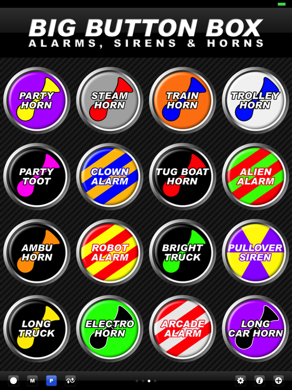 Big Button Box™ brings you an audio explosion of mega-annoying Alarms, Sirens & Horns for your iPad™!
