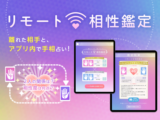 リモート相性/占い機能は、離れた場所にいる相手とでも、SNSやメールで手相を「シェア」して、相性が楽しめるメニューです。