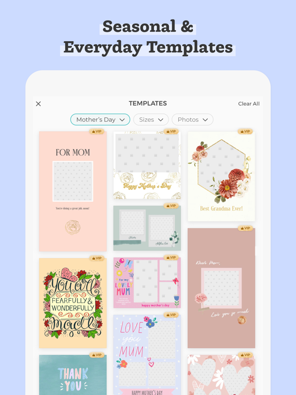 - Lots of FREE options in the app, including stickers, backgrounds, templates and fonts. If you enjoy these, you have the option of upgrading to VIP to get unlimited access to everything!