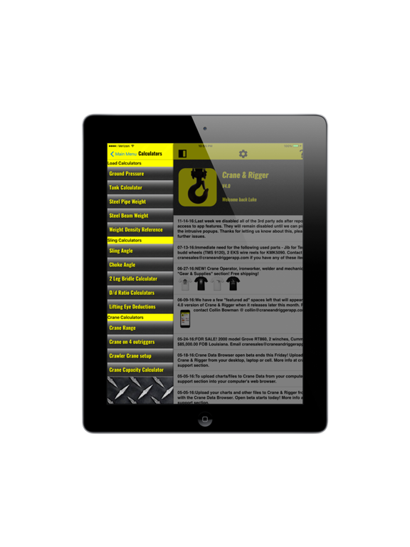 Quickly reference capacity charts on hundreds of rigging items from D-Rings to Slings. Calculate common rigging and load formulas quickly and easily with the various sling and load calculators. Browse our crane load chart, and specification database of over 1,000 crane models. Use the mat calculators to take the guess work and confusion out of proper crane matting. Quit lugging around all those books, brochures, and manuals get Crane & Rigger today!