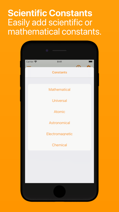 Common constants from both mathematical and scientific fields (astronomical, chemical, electromagnetic, etc.) are included for use in calculations.