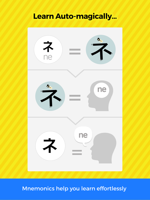 Each screen presents a Katakana character along with a mnemonic clue and audio clip. Read the clue, listen to the clip and move on to the next one. The alternating bold colors will 'reset' your brain so you start fresh with each character. Then take a quiz! You will be amazed at your ability to recall Katakana after just a few minutes.