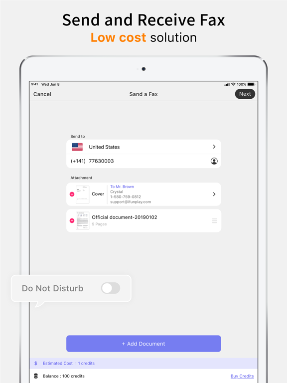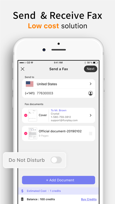 - In-App Fax: Send and receive faxes when you are out of office or have no fax machine at all. Fax documents to over 100 countries instantly (price calculated by the number of pages and recipient country and paid via in-app purchase). Perfect for business or personal use. You will receive a push notification to remind you of a fax status: Whether it is sent or received successfully or failed to deliver.