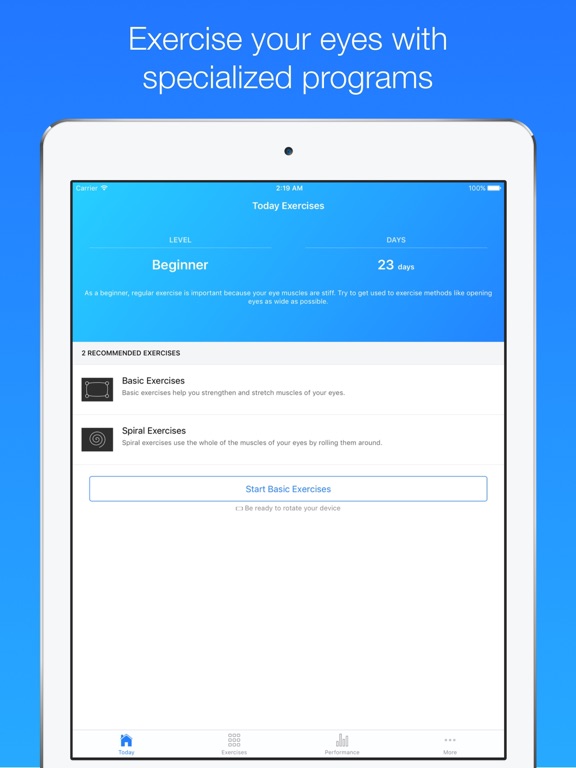 “I, like you, get tired eyes from looking into computers, books, TV and other people's eyes. I also have been wearing glasses since 1st grade, and at 58, I am now wearing progressive trifocals. This application has been a GOD send for the last four (4) years. Thank you!! The exercises are easy to follow and have worked wonders with my eye health. The recent improvements in the circular and spiral exercises are amazing.”