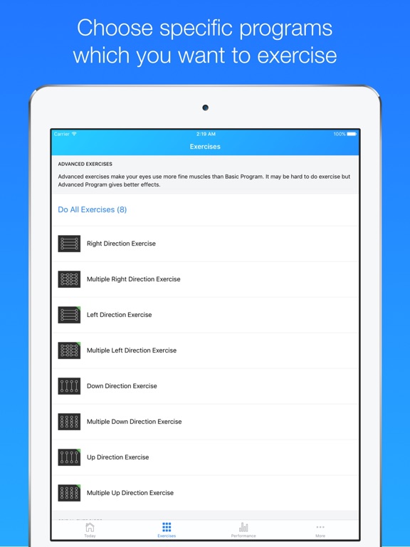 * Advanced eye muscle exercises - Advanced exercises make your eyes use more fine muscles than Basic Program. It may be hard to do exercise but Advanced Program gives better effects.