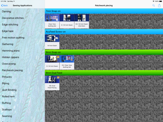 FootBook is a reference for more than 100 different feet and accessories for Janome sewing machines having a stitch width of 7mm or 9mm. The app includes photos and text describing each foot and explains how to use it. Each foot or accessory also has a high resolution video demonstrating its use. If you have a Janome machine with a top-load, drop-in bobbin, 7mm or 9mm stitch width, FootBook is the reference for you. If your machine requires the bobbins to go in a case behind a door in the front of the machine, then FootBook is NOT for you. If you have a machine made by Janome, but branded as Kenmore, New Home, or Elna, and it has a top-loading bobbin, then the featured feet should work for you, especially if your machine is computerized. Note that part numbers may not be correct if your machine is not branded as Janome.