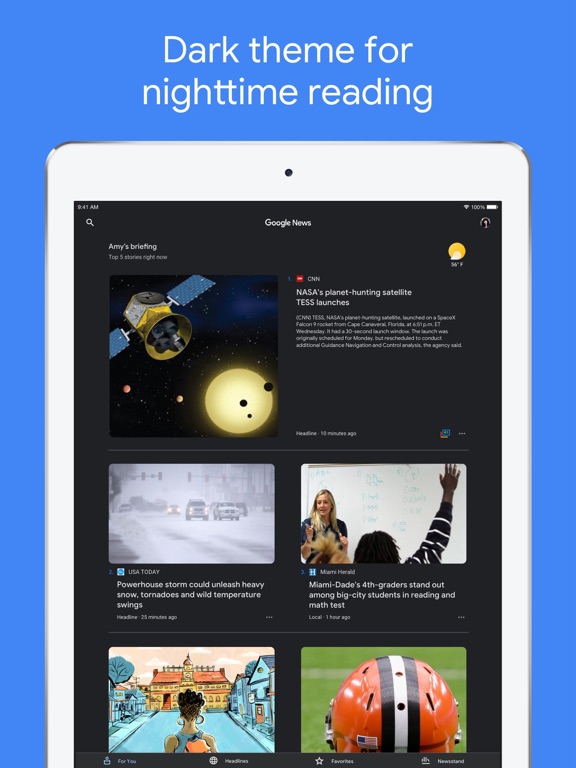 Your briefing – It can be nearly impossible to keep up with every story you care about. With your briefing, easily stay in the know about what’s important and relevant to you. Your briefing updates throughout the day bringing you the top five stories you need to know, including local, national, and world content.