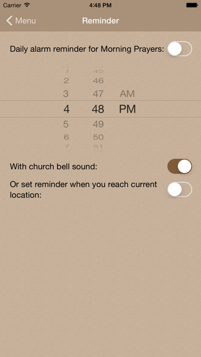 With reminder feature, you can set daily reminder or location-based reminder to encourage yourself to pray more. For the location-based reminder, continued use of GPS running in the background can dramatically decrease battery life.