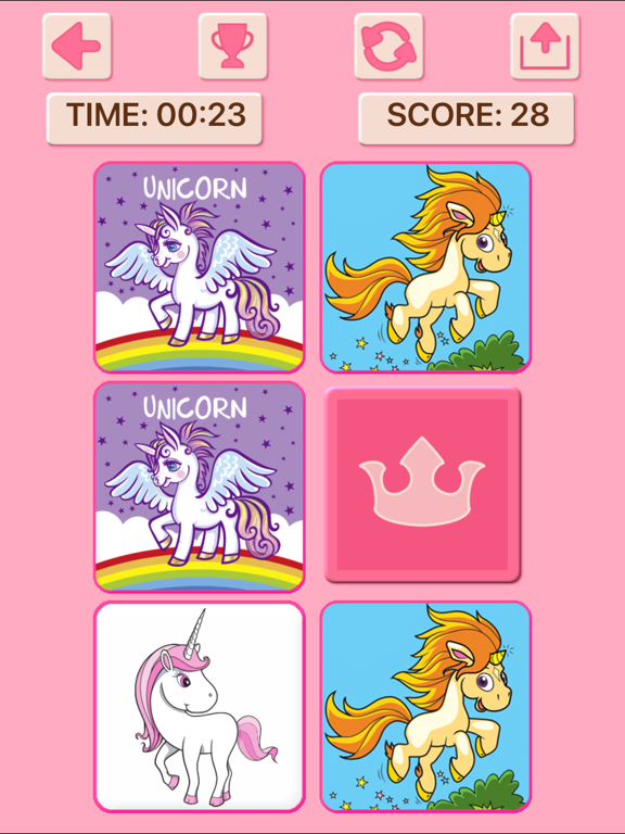 Here is a new wonderful Memory Game for all Princess and Unicorn lovers! Enjoy a lot of handcrafted cards on the many different topics like:  Princess, Fashion,  Unicorns, Mermaids, Fairies and others. Depending on your wishes and skills every cards set can be played with 5 levels of difficulty from 6 to 30 cards. Beautiful music will accompany the gameplay and will help you to keep attention and concentration.