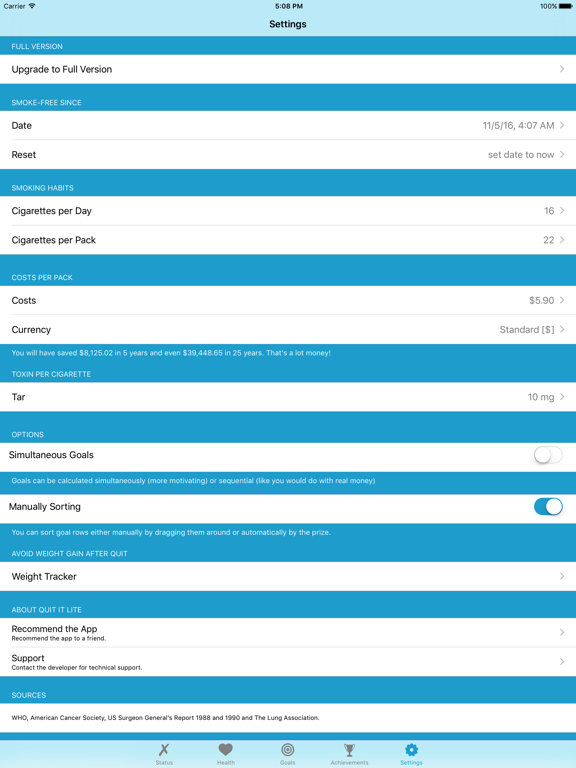 It keeps track of the cigarettes you did not smoke and how much money you are saving. Furthermore it shows the benefits of quitting as text and calculates a nice ranking for you.
