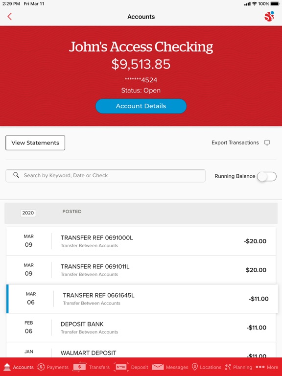 • Review activity and balances in your Synovus checking, savings, loan, and credit card accounts